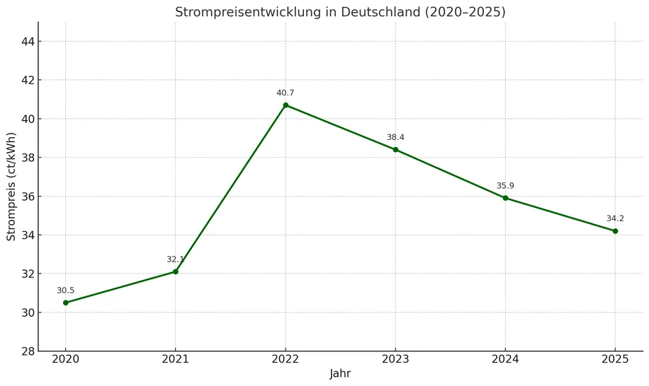 Die Strompreise für Haushalte in Deutschland sind in den letzten Jahren deutlich gestiegen. Besonders im Jahr 2022 war ein starker Preissprung zu beobachten - bedingt durch gestiegene Netzentgelte, CO₂-Abgaben und Investitionen in die Energiewende. Zwar ist seitdem eine leichte Entspannung zu erkennen, doch das Preisniveau im Jahr 2025 liegt weiterhin deutlich über dem Stand von 2020.
